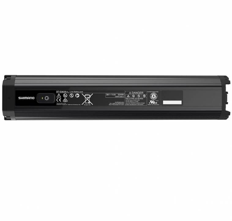 Shimano STEPS BT-E8035-L 504Wh Akku integriertDer extrem kompakte, strapazierfähige und wasserfeste Shimano Steps Akku BT-E8035-L (integriert und ermöglicht ein schlankes Rahmen-Design) besitzt ein speziell für E-MTBs entwickeltes Low-Profile-Design für mehr Stoß- und Vibrationsfestigkeit. Der Hochleistungs-Akku mit ausgezeichneter Reichweite sowie 504 Wh bietet konsistente Wiederaufladung und ist mit der SHIMANO E8000 E-MTB Serie kompatibel.