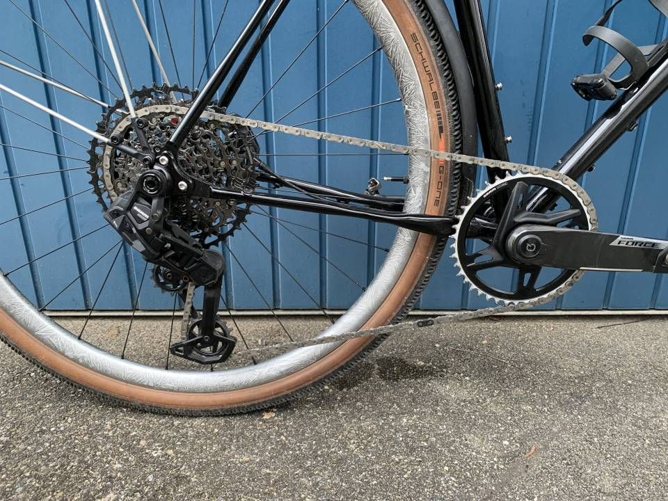 - Force 1x Kurbelgarnitur mit 165mm und integriertem Powermeter, die Kette ist gewachst